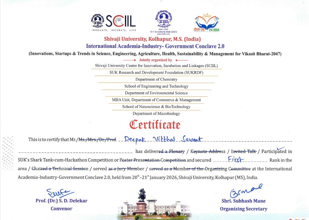 Dr. Deepak Sawant, Assoc.Professor, Microbiology secured First Rank in Shark Tank-cum-Hackathon Competition at the International Academia-Industry-Government Conclave 2.0 held from 20-21 January, 2026, Shivaji University, Kolhapur