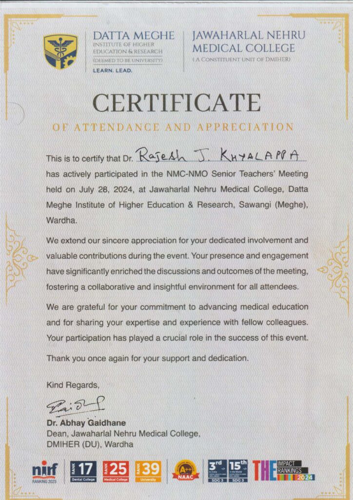 Dr. Rajesh Khayalappa has received Certificate of Attendance and Appreciation. Dr. Sharma has actively participated in NMC-NMo Senour Teachers' Meeting at Jawarharlal Neharu Medical College, Datta Meghe Institute of Higher Education & Research, Sawangi(Meghe) Wardha