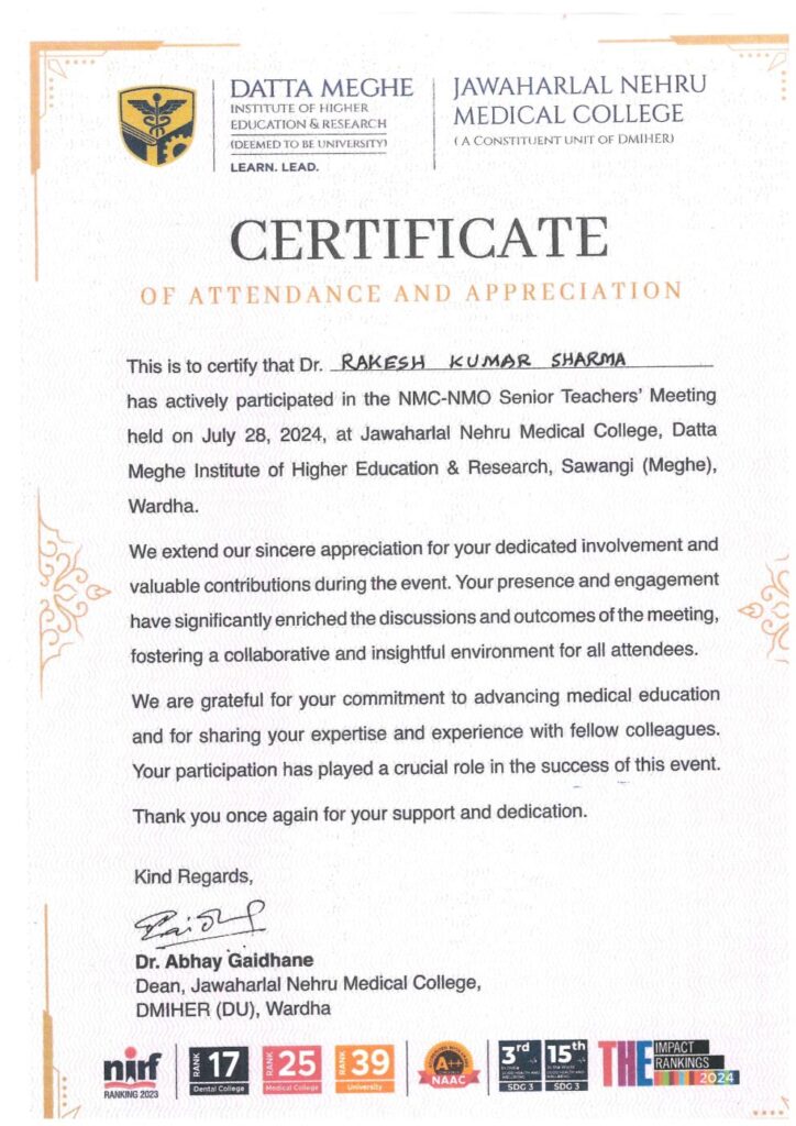 Dr. Rakesh Kumar Sharma has received Certificate of Attendance and Appreciation. Dr. Sharma has actively participated in NMC-NMo Senour Teachers' Meeting at Jawarharlal Neharu Medical College, Datta Meghe Institute of Higher Education & Research, Sawangi(Meghe) Wardha
