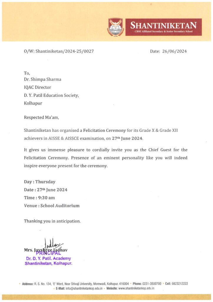 Dr. Shimpa Sharma has invited as the Chief Guest for Felicitation Ceremony by Shantiniketan School