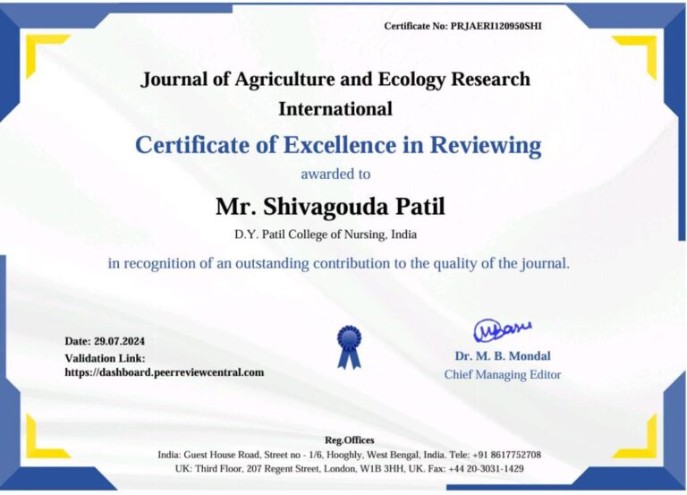 Dr. Shivagouda Patil has received Certificate of Excellence in Reviewing in recognition of an outstanding contribution to the quality of the Journal by Journal of Agriculture and Ecology Research Internaitonal