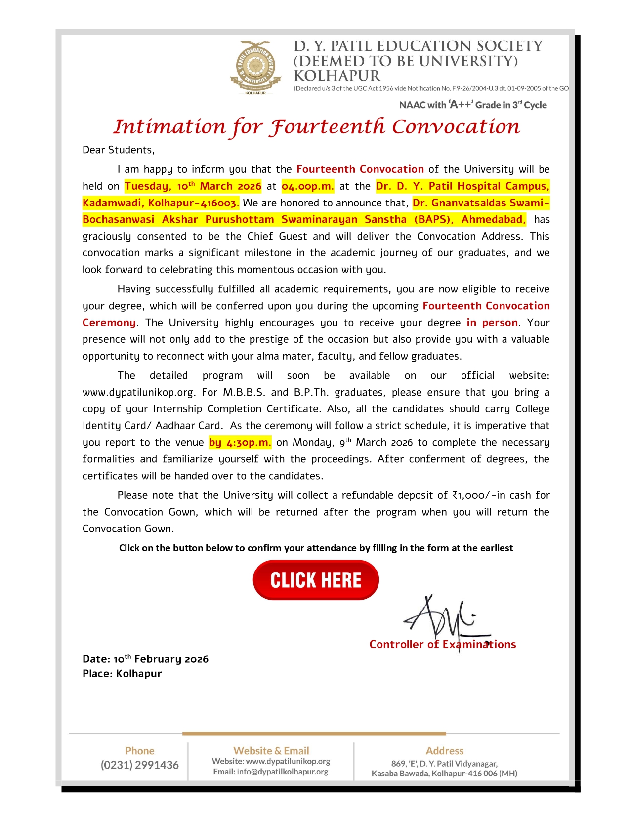 The D.Y. Patil Education Society (Deemed to be University) was established under Section 3 of the UGC Act 1956 vide MHRD notificationNo: F.9-26/2004-U-3dated 01.09.2005. The Sponsoring Society is registered under Societies Registration Act, 1860 with Registration No. Maharashtra/32907/Kolhapur on 21.11.2013.